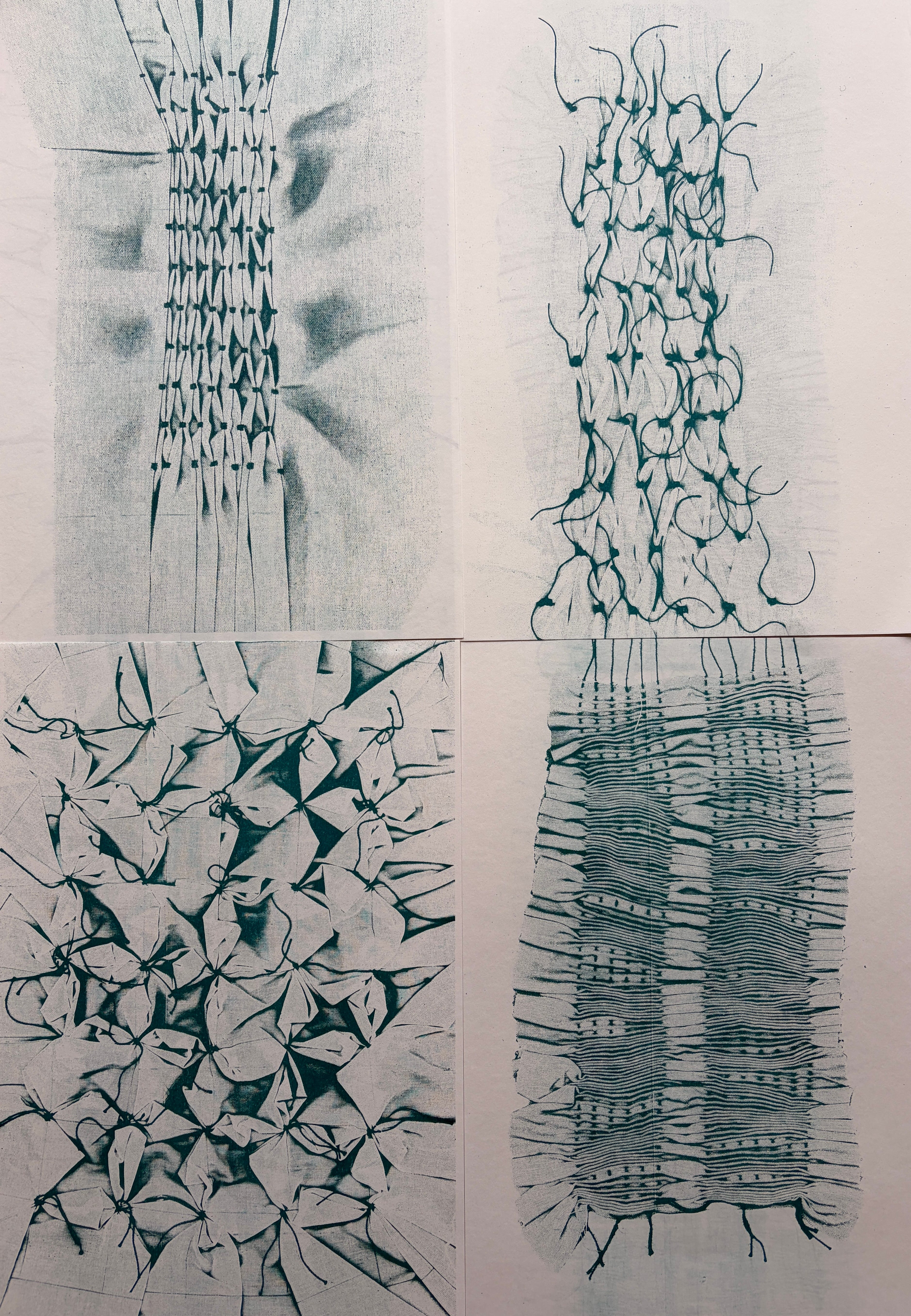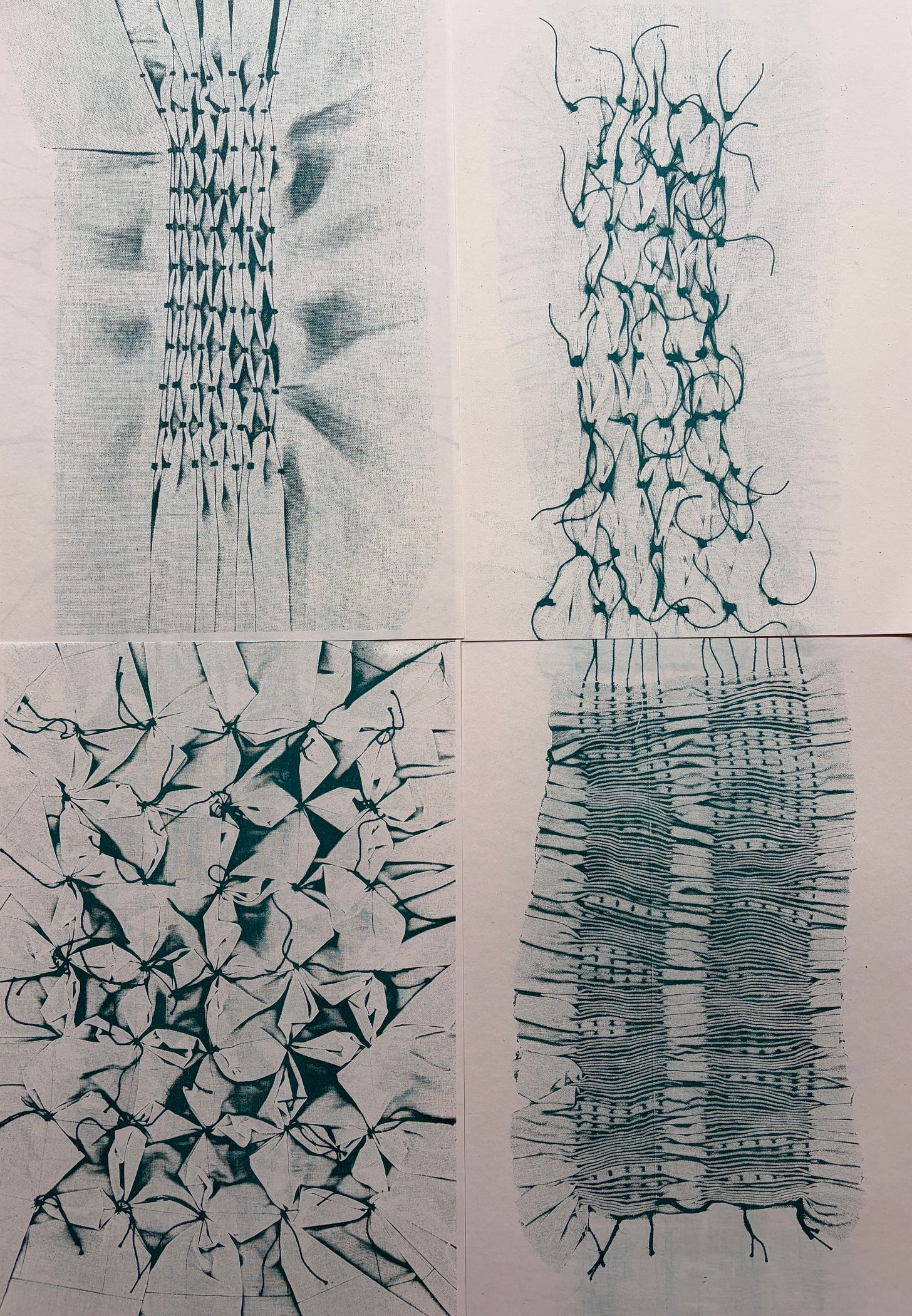 and this week I did the same on the riso machine at LCBA. I know it would be technically more correct, maybe better, to scan or photograph the smocks then twiddle about with black and white conversions and Photoshop and stuff, but I actually really like just putting the fabrics on the machine’s flat bed and pressing the big green button. Someone had left the teal ink drum in the machine, and I was surprised by how much I liked the effects it creates. I also experimented with neon pink and aqua and overprinting, and decided I very much like riso prints. I’ll do more and bind them by hand into bigger books.
