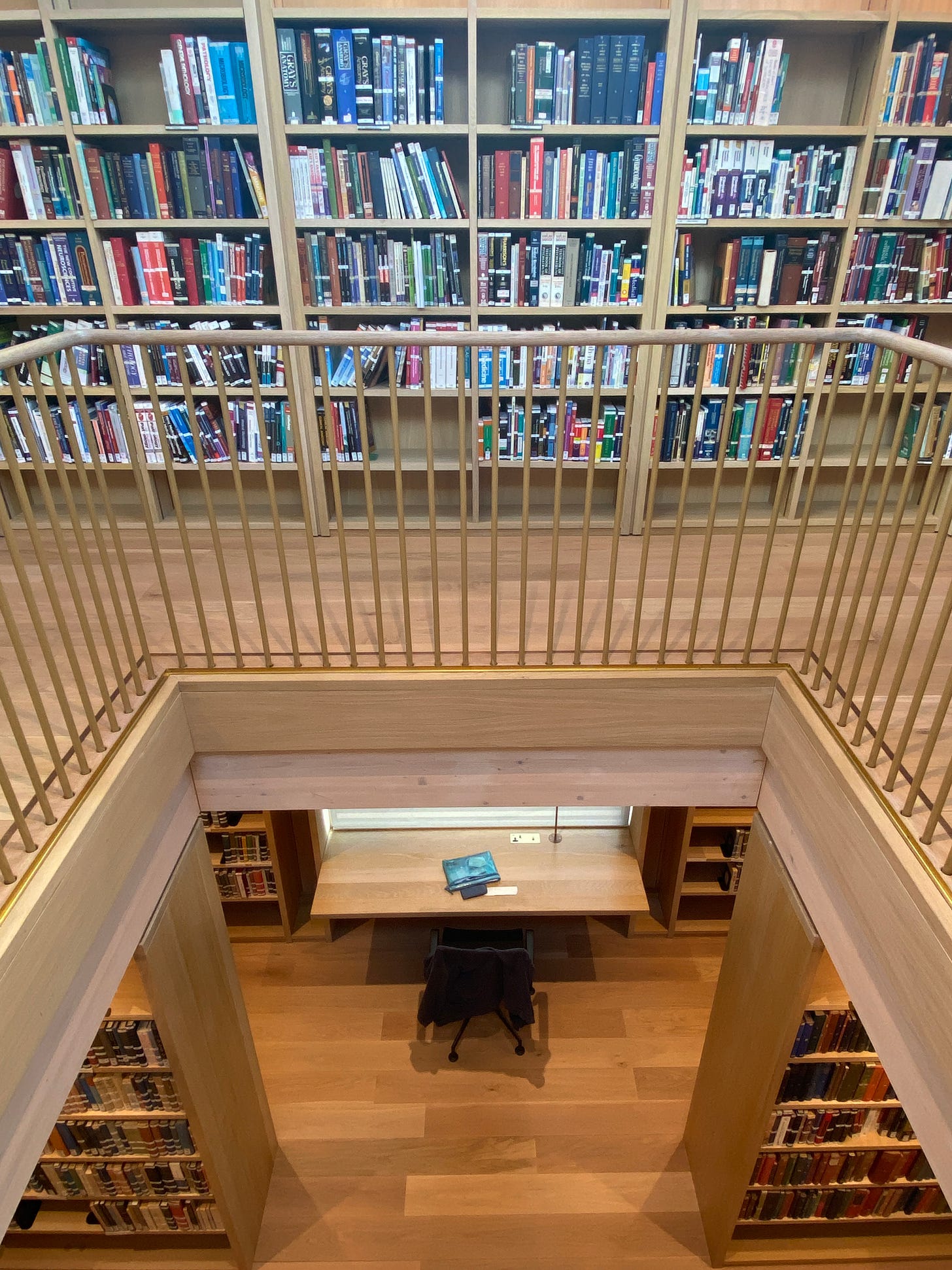 And the conference wasn’t all abstract. It included a visit with the architect to the quite wonderful new library at Magdalene College (above) which this week won the Stirling Prize. Made of the highest quality bricks, stone, and wood, it is a beautiful, concrete/not actually concrete expression of ideas about libraries, wisdom, and real books. It also accommodates all sorts of readers, from the most extrovert who want to sit at a long, shared, central table to the most introvert who prefer to sit facing a (very lovely) brick wall with their backs to the room. I think I’d be tempted spend far too long trying, as Goldilocks might, all the different spots, and then feel aggrieved when someone else takes ‘my’ desk.